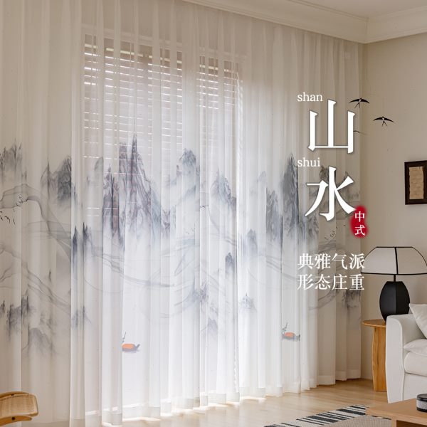 新中式紗簾水墨山水畫國風茶室窗簾印花書房客廳隔斷紗簾定制掛鉤