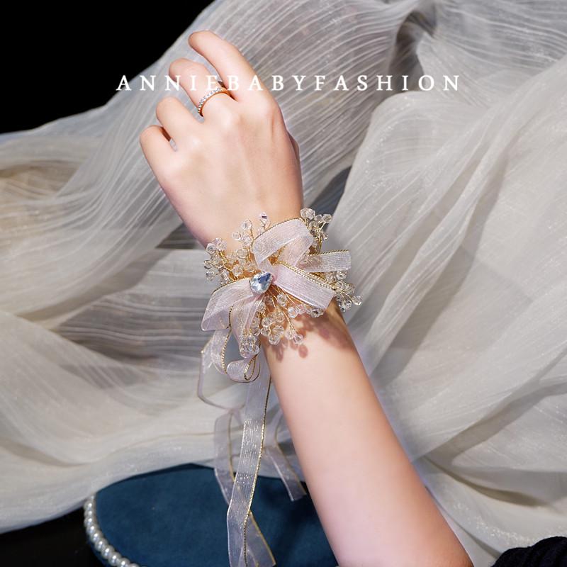 ins手花重工白色水晶枝唯美紗帶手腕花新娘伴娘姐妹團跳舞手環